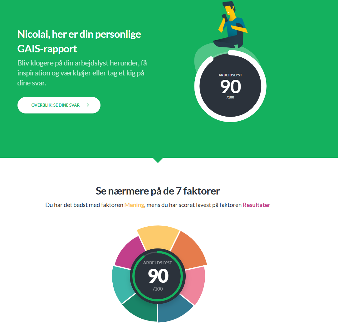 Din personlige GAIS-rapport bliver lavet på baggrund af dine besvarelser. Den består af to dele. Én del, hvor GAIS trækker pointer og udvalgte resultater ud af dine besvarelser og kobler konkrete handlingsanbefalinger på. Helt konkret får du på baggrund af dine besvarelser målrettede artikler og anbefalinger til, hvordan du kan forbedre din egen arbejdslyst.