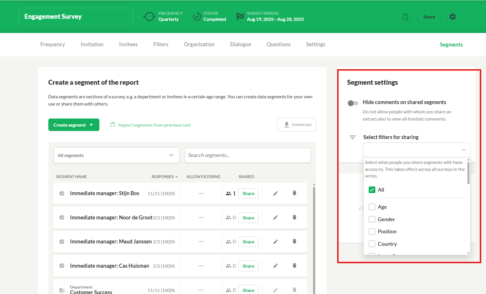 - Hide comments in shared segments: If you enable this feature, none of the people you share segments with will be able to see participants’ free-text comments.