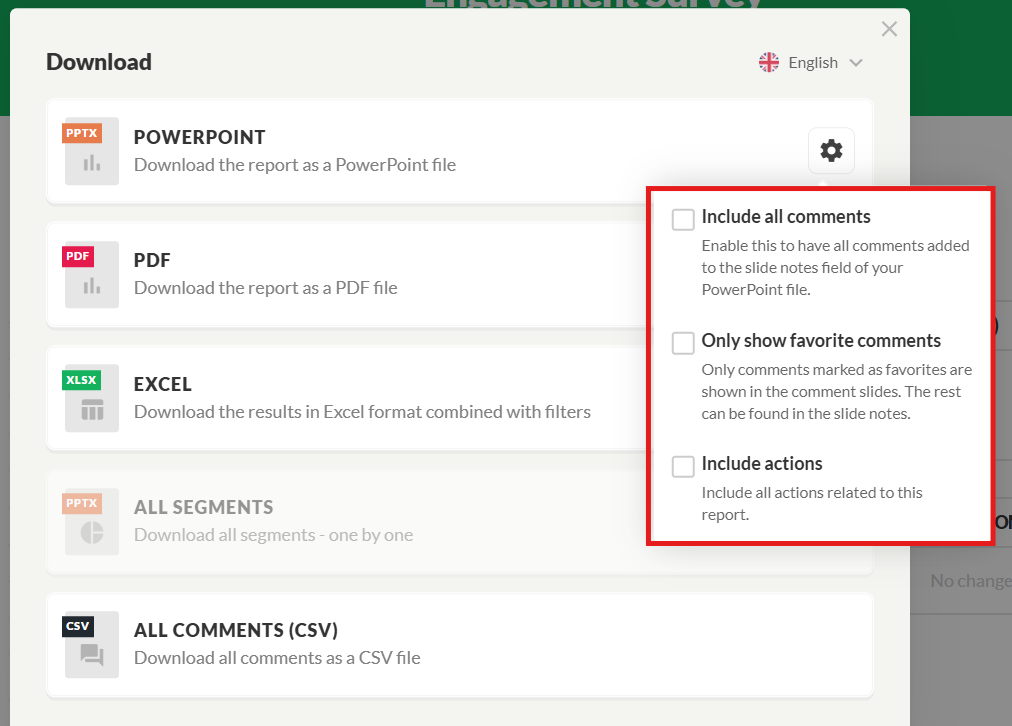 - PowerPoint: The full report can be downloaded in an editable PowerPoint format. Choose whether you want to include all, or only some, comments and actions.