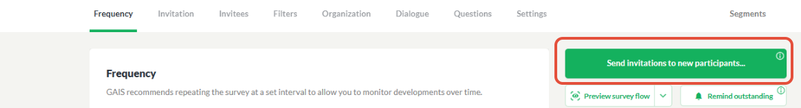 If you are using an organisation setup and have uploaded a new data file, the system will automatically allow you to send invitations to new participants. Once the new file is uploaded, go back into the survey — the “Send” button will now say “Send invitation to new participants.”